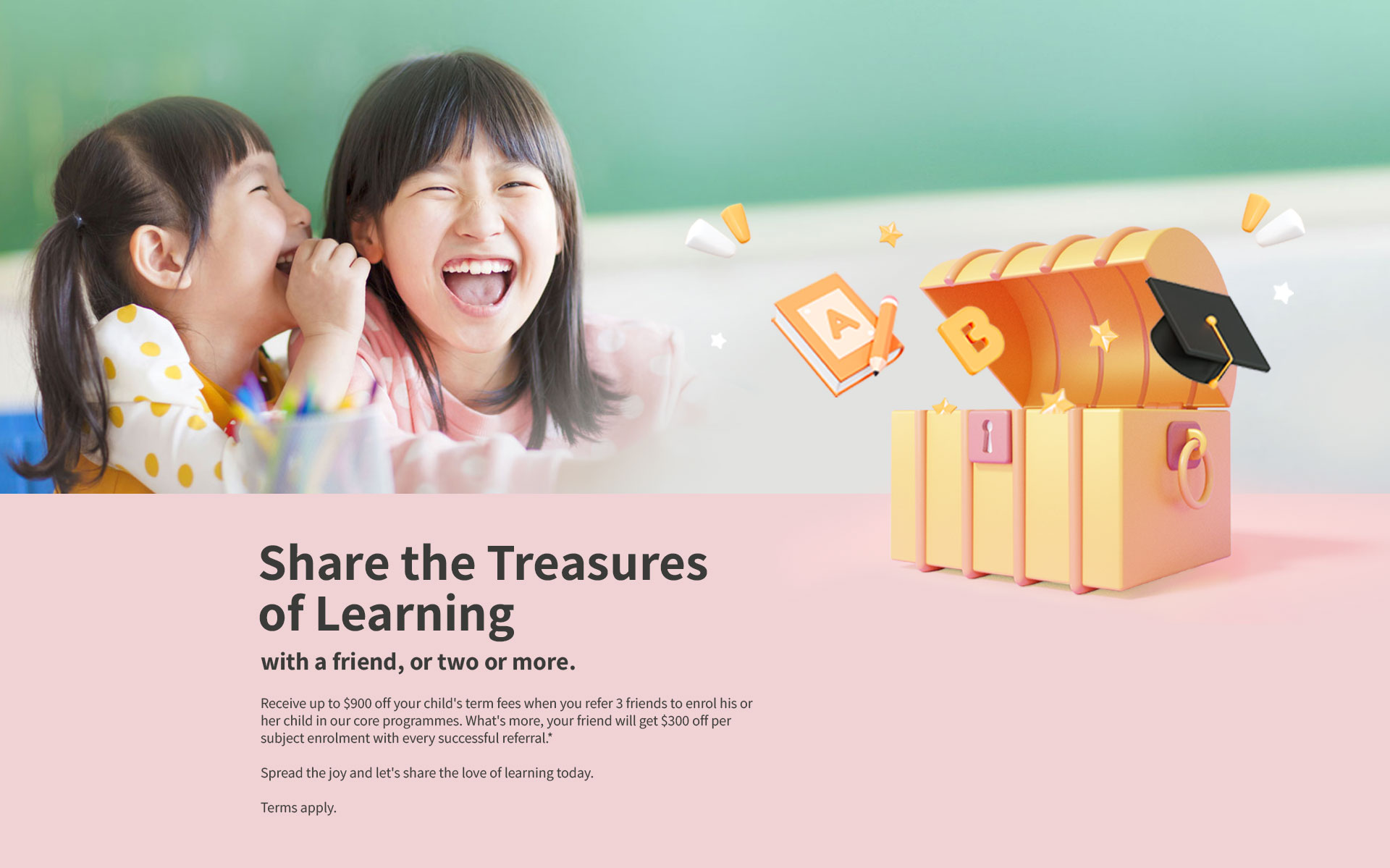 For example, if Referred Parent enrols one child for 3 subjects and made the full term’s fees, he or she will receive: SGD 300 x 3 = SGD 900 off that term fees